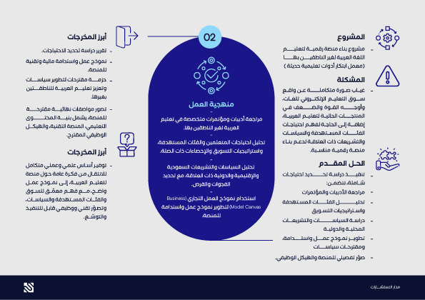 توفير أساس علمي وعملي متكامل للانتقال من فكرة عامة حول منصة لتعليم العربية، إلى نموذج عمل واضح، مع فهم معمّق للسوق والفئات المستهدفة والسياسات، وتصوّر تقني ووظيفي قابل للتنفيذ والتوسّع.