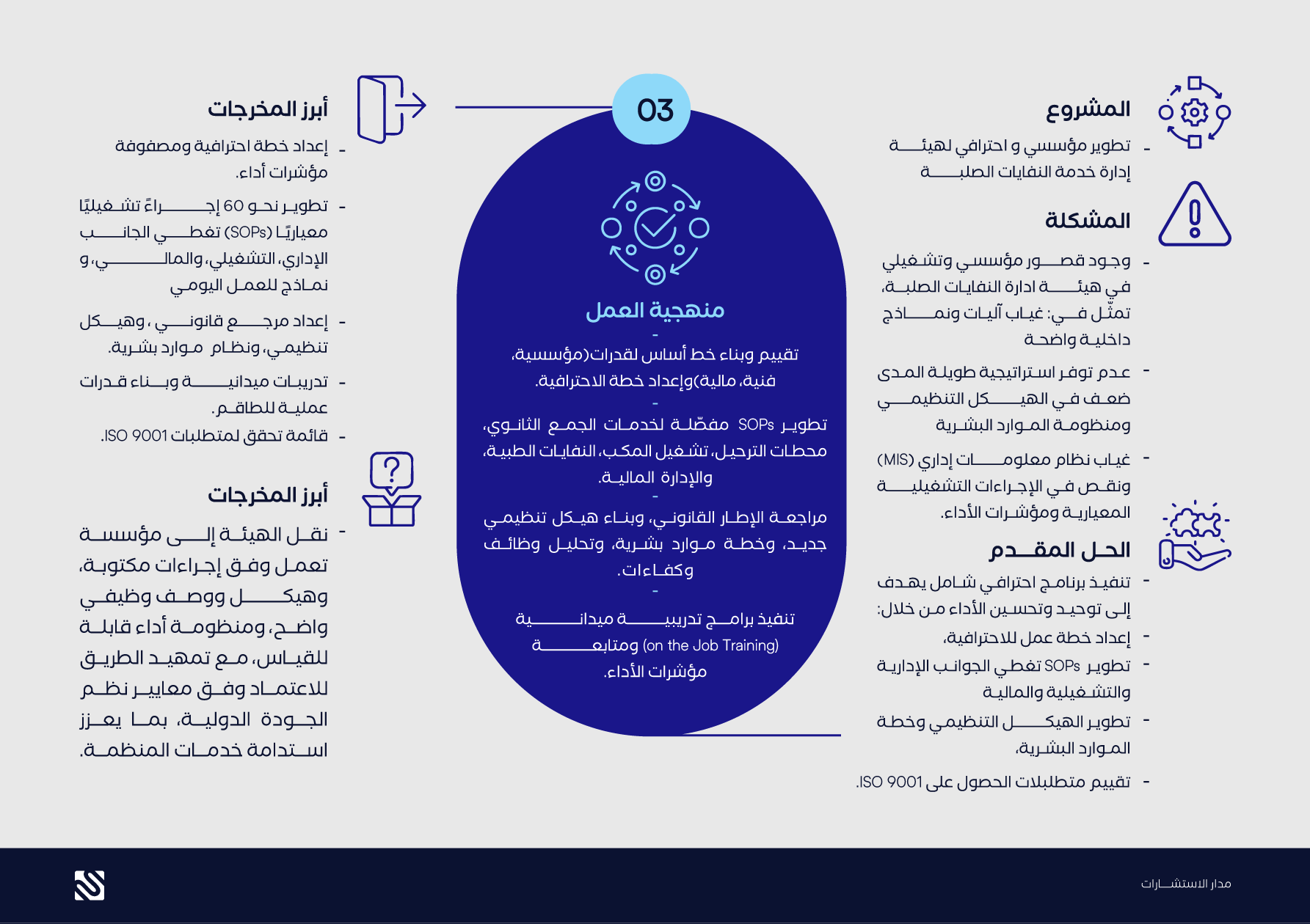 مراجعة الإطار القانوني، وبناء هيكل تنظيمي جديد، وخطة موارد بشرية، وتحليل وظائف وكفاءات.